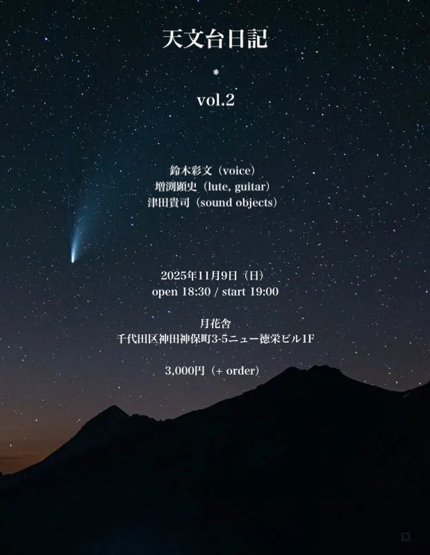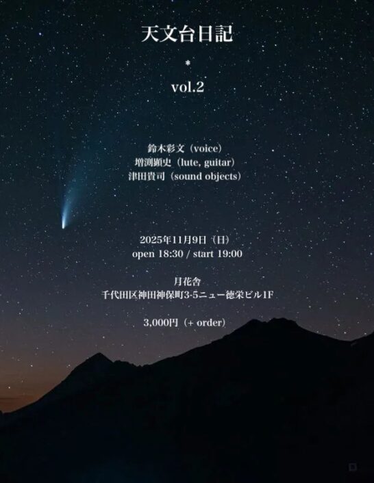 Instagram 月花舎 天文台日記 vol.2 Date: November 9, 2025 Time: 7:00 pm Location: Tokyo, Japan Venue: 月花舎 Fee: 3,000円(+ドリンクオーダー) 鈴木彩文(voice)+増渕顕史(lute,guitar)+津田貴司(sound objects) Other Events November 30, 2025 Knock Koenji 梅 𝗥𝗲𝗰𝗼𝗿𝗱𝘀 𝗽𝗿𝗲𝘀𝗲𝗻𝘁𝘀 𝗝𝘂𝗹𝗶𝗲 𝗛𝗶𝗹𝗹 Tokyo, Japan December 6, 2025 月花舎 「未来の場」vol.12 Tokyo, Japan December 12, 2025 sint-remigiuskerk Ayami Suzuki, Florence Cats Brussels, Belgium December 18, 2025 Bar Neun Ayami Suzuki & Perila, Makoto Oshiro (DJ) and more Berlin, Germany