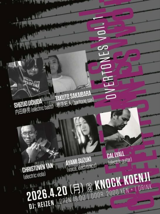 Knock Koenji OVERTONES vol.1 Date: April 20, 2026 Time: 7:00 pm Location: Tokyo, Japan Venue: Knock Koenji Door: 2000yen Live 内田静男 | Shizuo Uchida + 堺原拓人 | Takuto Sakaibara Christoven Tan (viola, from Singapore) + Ayami Suzuki (voice) + Cal Lyall (guitar) DJ Reizen Other Events April 25, 2026 POLARIS 未完の共鳴 Tokyo, Japan